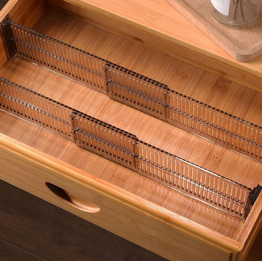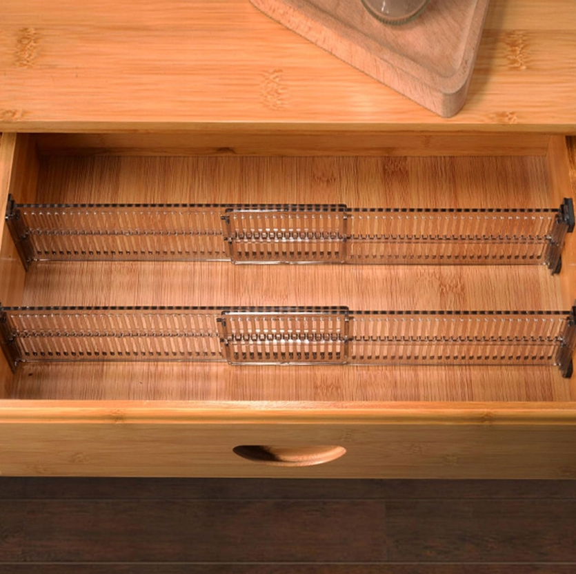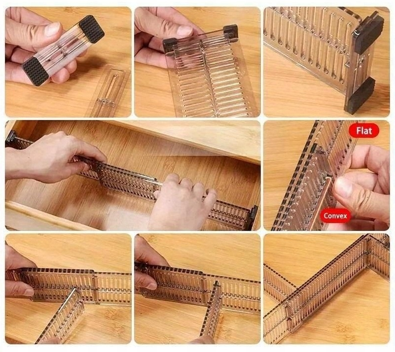 Rozszerzalna budowa przegród zapewnia stabilne dopasowanie do wnętrza szuflady, zapobiegając przesuwaniu się organizera podczas jej otwierania i zamykania. To uniwersalne rozwiązanie sprawdzi się nie tylko w garderobie, ale również w komodzie, szafce czy organizerze na drobne akcesoria.