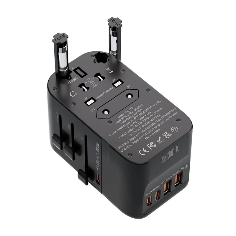 BlitzWolf BW-TA1 oferuje aż pięć portów ładowania: dwa USB-A 20W (PD), dwa USB-C 18W (QC) oraz jeden port USB-C PD 100W (GaN), co zapewnia możliwość jednoczesnego ładowania kilku urządzeń. Technologia GaN (azotek galu) zwiększa efektywność energetyczną, zapewniając szybkie i stabilne zasilanie nawet dla wymagających sprzętów, takich jak laptopy. Zasilanie wejściowe 100V-240V AC oraz maksymalna moc 2400W sprawiają, że adapter świetnie sprawdzi się w podróży zarówno do ładowania smartfonów, jak i bardziej energochłonnych urządzeń.