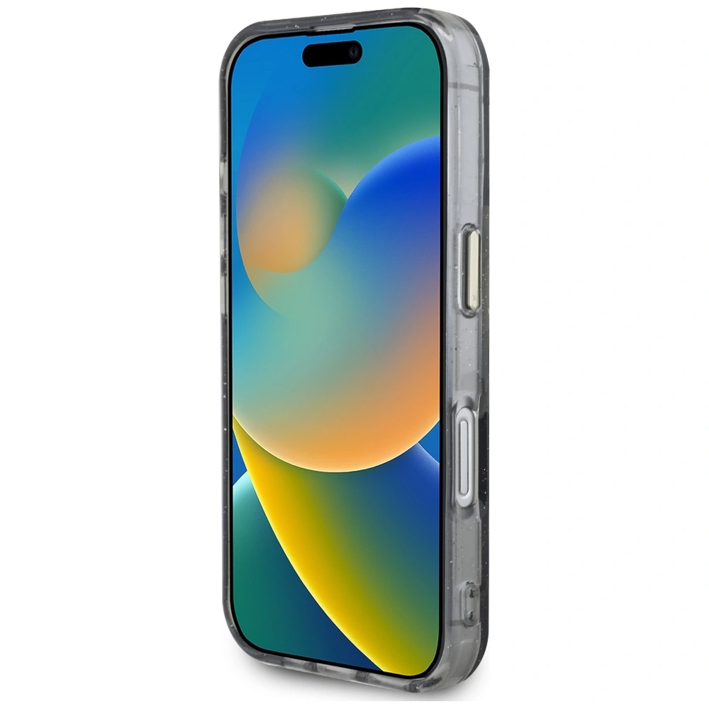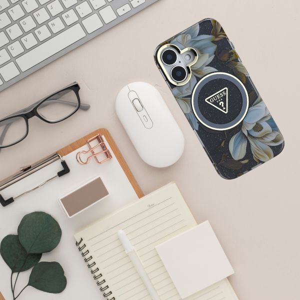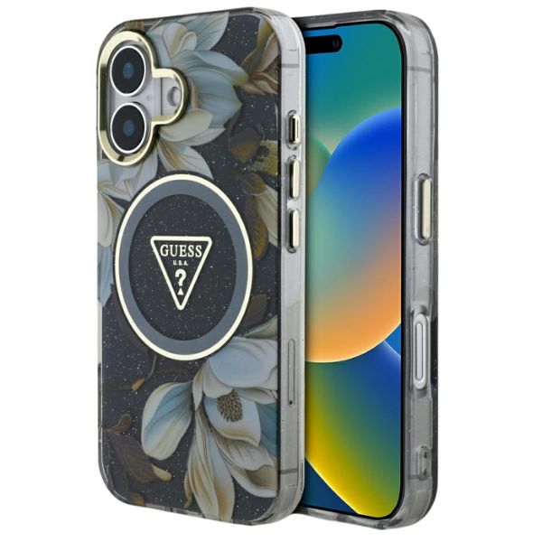 Etui Guess Glitter Flowers Triangle Buttons MagSafe do Apple iPhone 16 czarny