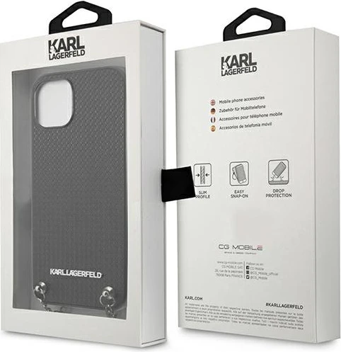 Etui wykonane są z wysokiej klasy eko skóry o kratkowanej strukturze ozdobione srebrnym logo Karla Lagerfelda, całości dopełnia srebrny łańcuszek, dzięki któremu możesz nosić swoje etui na szyi lub ramieniu.