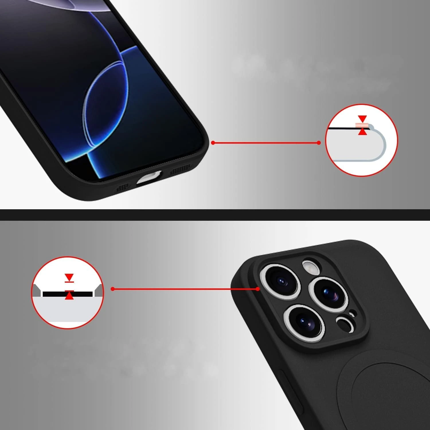 Materiał Liquid Silicone zapewnia ochronę przed skutkami upadków. Podwyższone ranty dookoła wyspy aparatu dodatkowo chronią obiektywy smartfona.