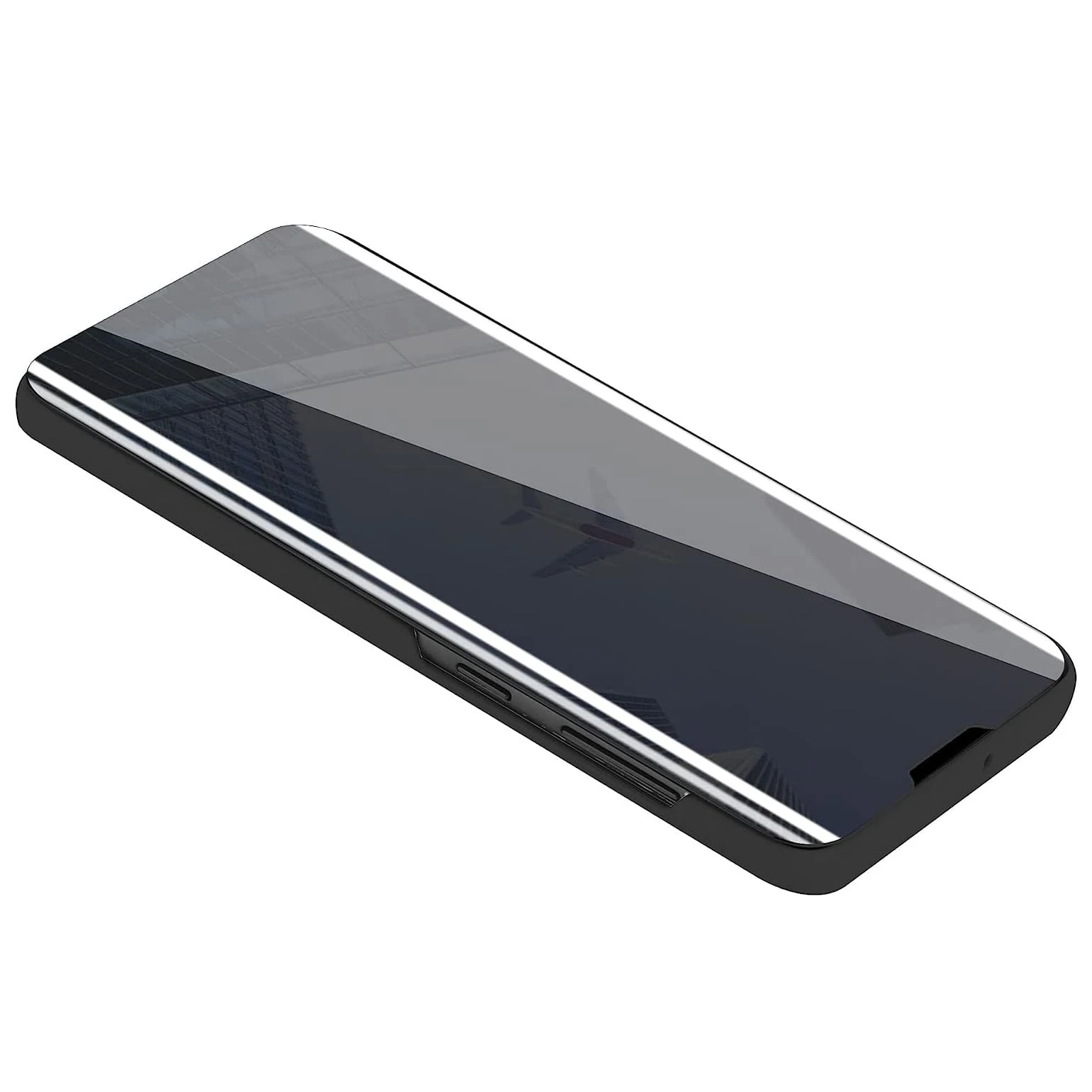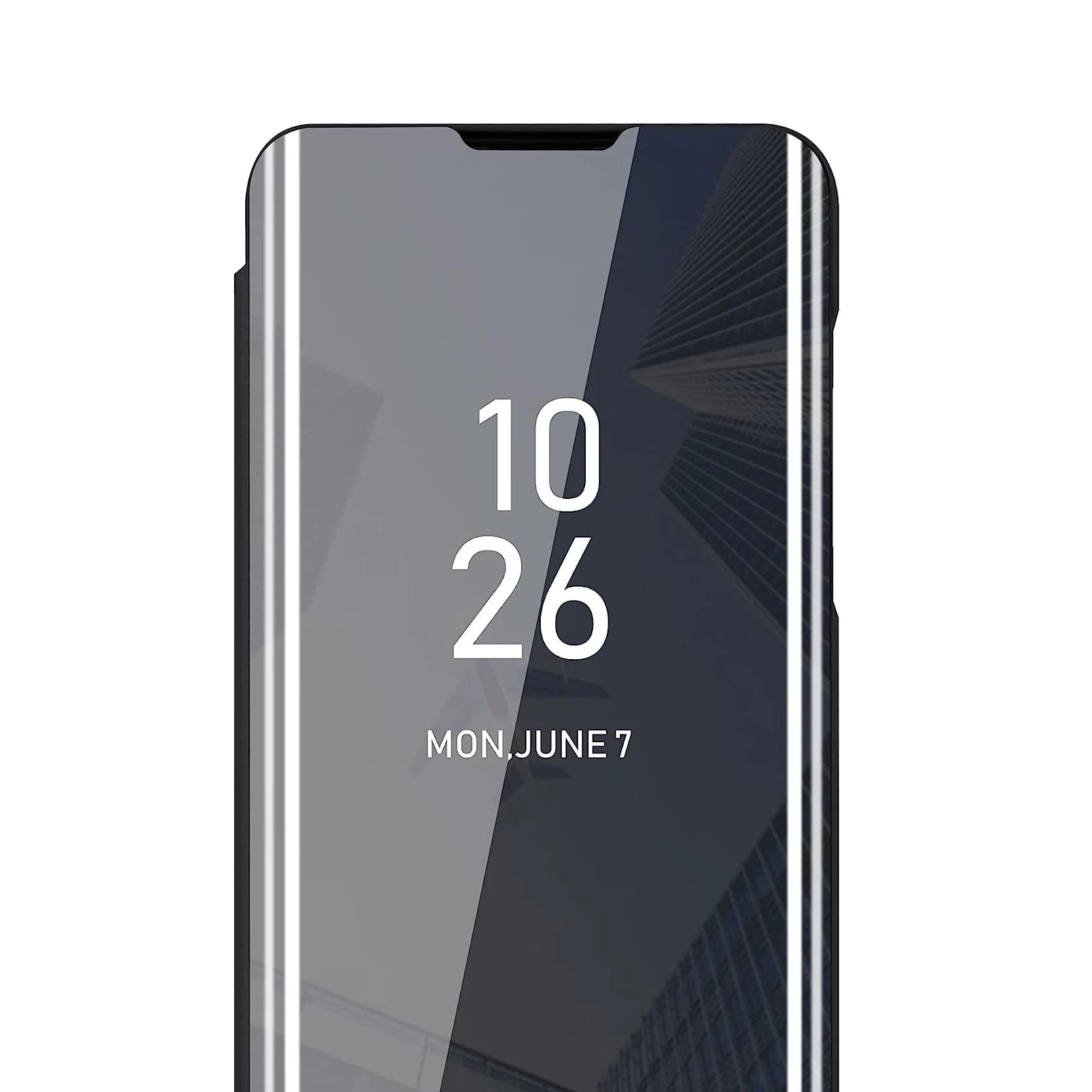Przednia klapka wykonana jest z lustrzanego, półprzezroczystego tworzywa, pozwalającego na podejrzenie godziny bez otwierania etui. Tył etui wykonany jest z najwyższej jakości miękkiego, matowego materiału, który doskonale leży w dłoni i jest przyjemny w dotyku. Wycięcie na aparat chroni obiektyw przed uszkodzeniem w trakcie użytkowania smartfona.