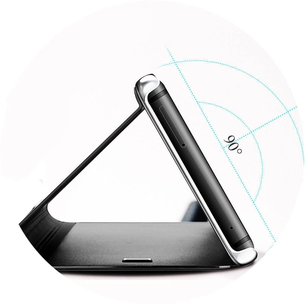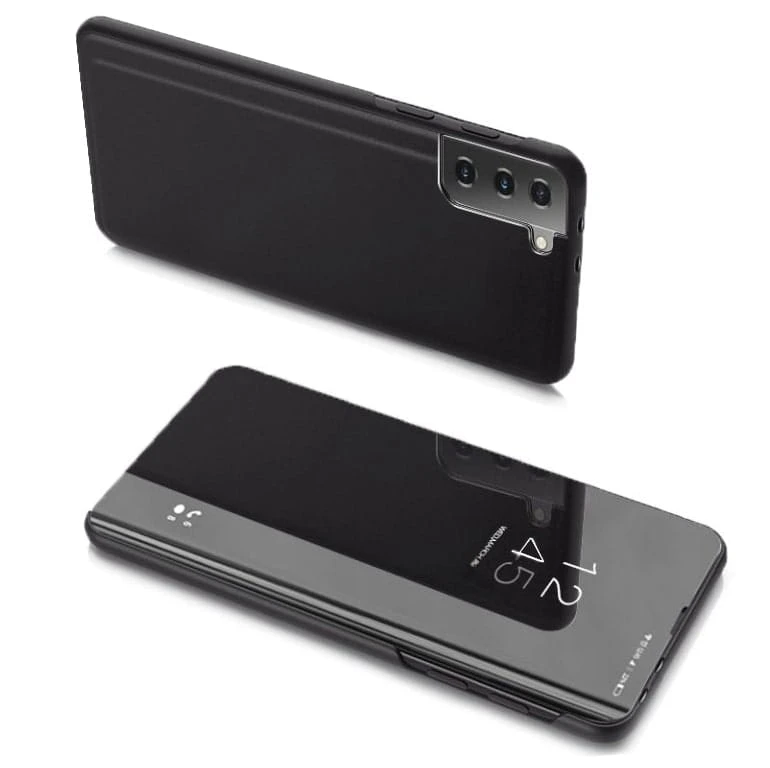 Przednia klapka wykonana jest z lustrzanego, półprzezroczystego tworzywa, pozwalającego na podejrzenie godziny bez otwierania etui. Tył etui wykonany jest z najwyższej jakości miękkiego, matowego materiału, który doskonale leży w dłoni i jest przyjemny w dotyku. Wycięcie na aparat chroni obiektyw przed uszkodzeniem w trakcie użytkowania smartfona.