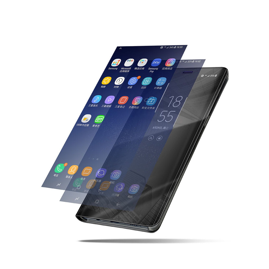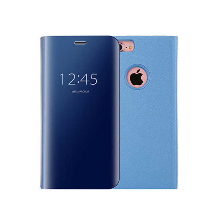 Przednia klapka wykonana jest z lustrzanego, półprzezroczystego tworzywa, pozwalającego na podejrzenie godziny bez otwierania etui. Tył etui wykonany jest z najwyższej jakości miękkiego, matowego materiału, który doskonale leży w dłoni i jest przyjemny w dotyku. Wycięcie na aparat chroni obiektyw przed uszkodzeniem w trakcie użytkowania smartfona.