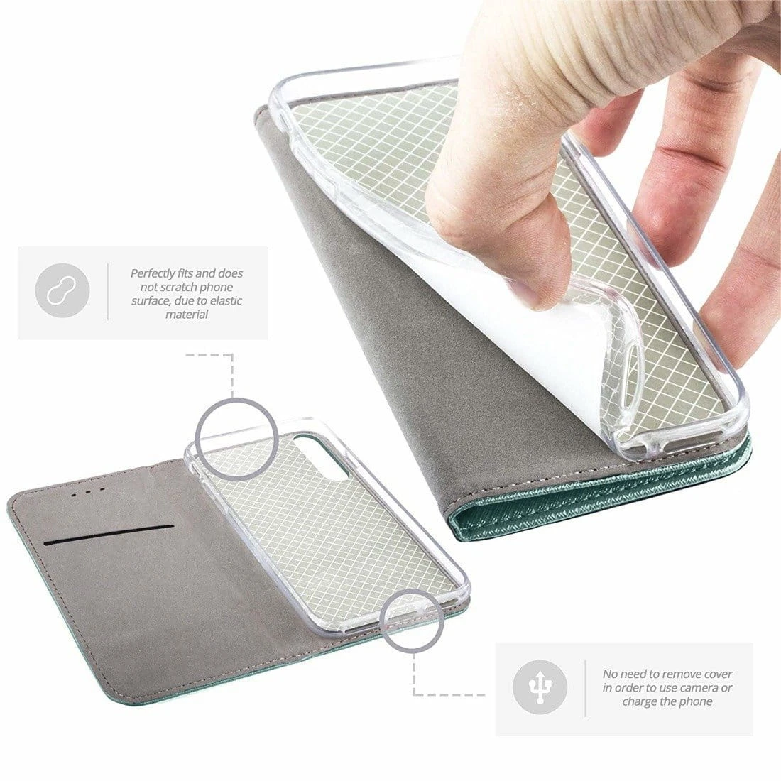 Funkcjonalny futerał wykonany z wysokiej jakości skóry ekologicznej i zintegrowanego silikonowego backcase'u zabezpiecza telefon przed zarysowaniami.