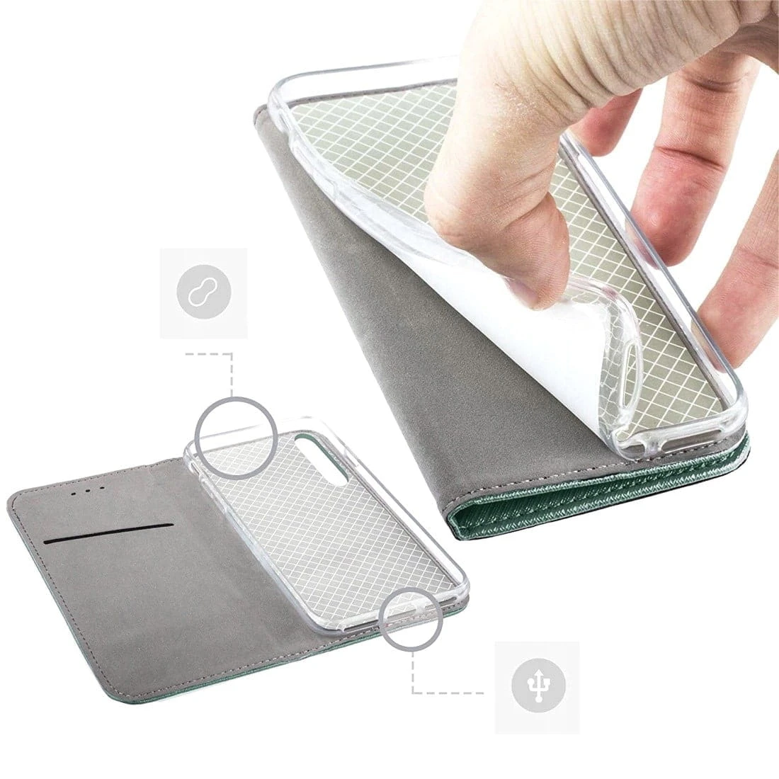 Futerał jest otwierany na bok. Dzięki wewnętrznej kieszeni na kartę czy banknot pełni także funkcję portfela.