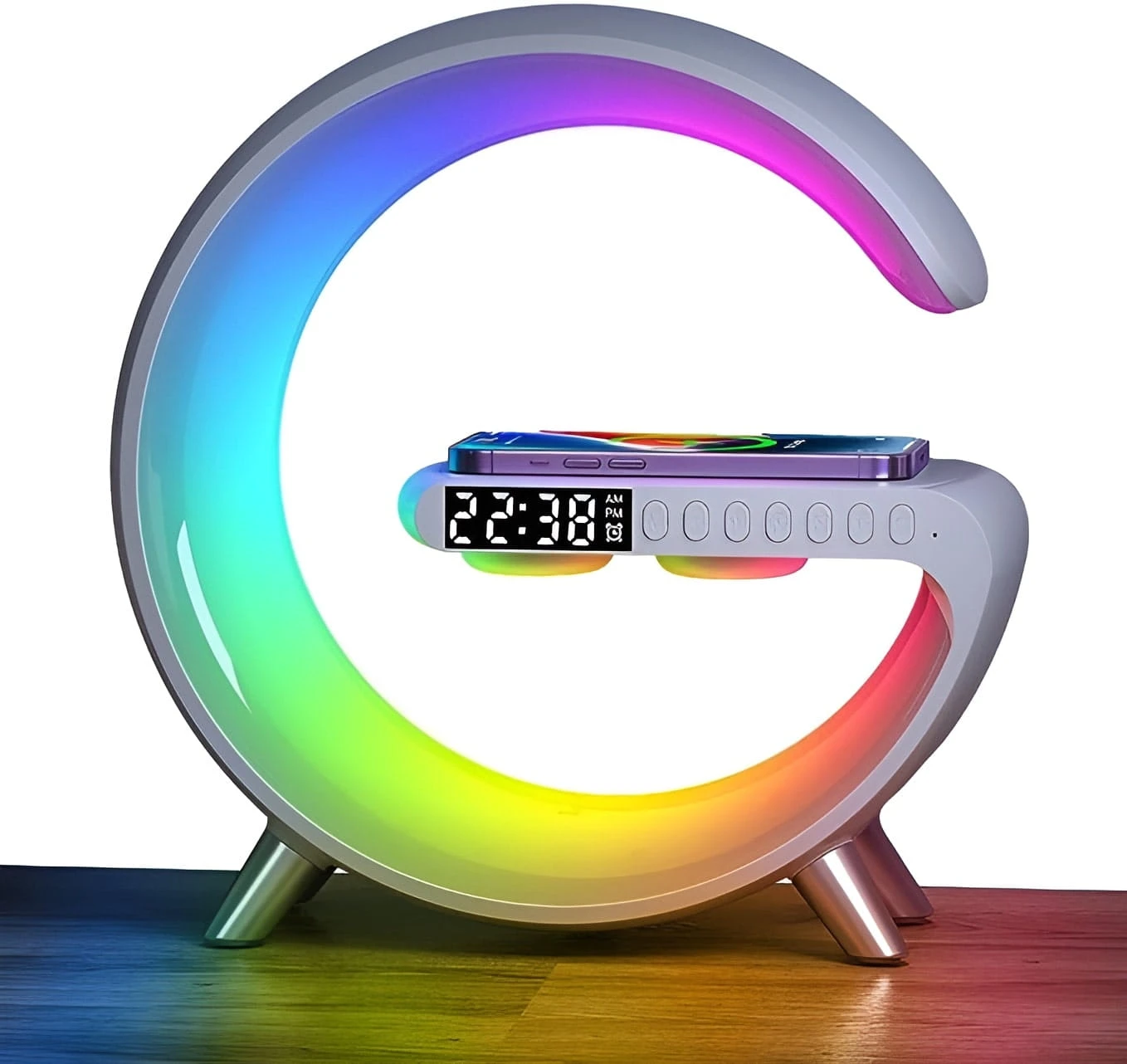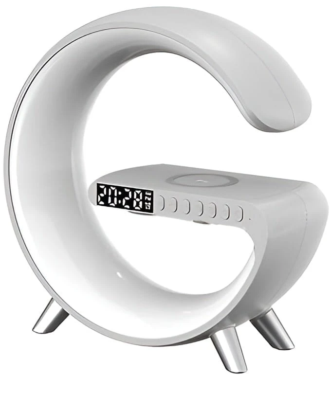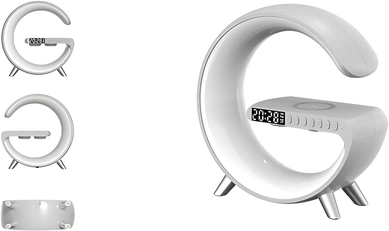 Inteligentna Lampka Stacja Ładująca Bezprzewodowa Biała LED z Zegarkiem i Głośnikami