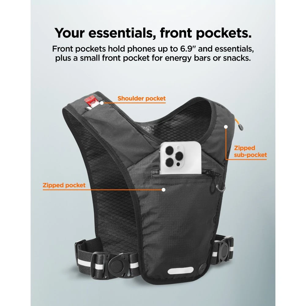 Kamizelka wyposażona jest w szybkozłączny zamek błyskawiczny, który zapewnia bezpieczne dopasowanie i ułatwia zakładanie oraz zdejmowanie podczas biegu. Przednia kieszeń pomieści smartfony o przekątnej ekranu do 6,9 cala, umożliwiając łatwy dostęp do najważniejszych przedmiotów. Tylna kieszeń z klipsem na klucze pozwala bezpiecznie przechować portfel i klucze. Dodatkowo, kamizelka posiada kieszeń na ramieniu do szybkiego dostępu oraz odblaskowe detale z przodu i z tyłu, które zwiększają widoczność podczas porannych lub nocnych biegów.