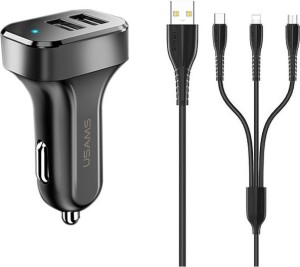 Usams King Tu series, ładowarka samochodowa C13 z podwójnym portem USB 2,1A i kablem U35 z trzema końcówkami: lightning, microUSB, USB-C.