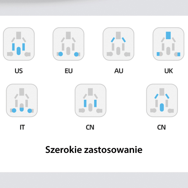 Uniwersalny adapter podróżny od znanej i cenionej marki USAMS działa w ponad 200 krajach na świecie z czterema różnymi rodzajami wtyczek - US / AU / EU / UK. Dzięki temu urządzeniu potrzebujesz tylko jednego adaptera w Twoich podróżach po świecie.