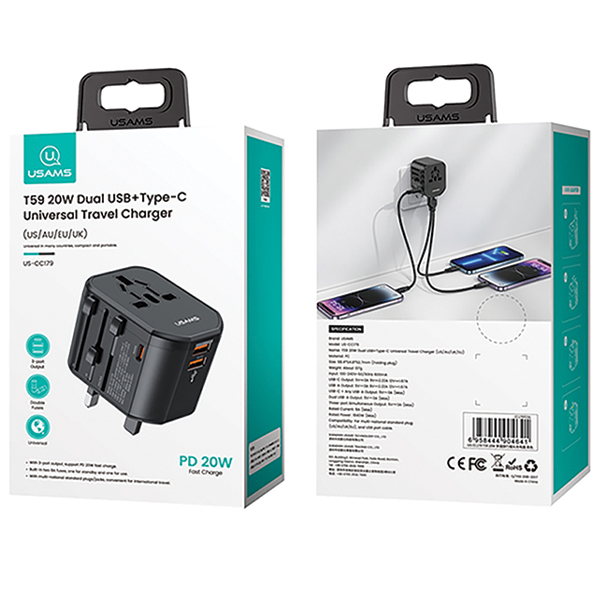 Ładowarka sieciowa 4w1 USAMS T59 adapter podróżny US/AU/EU/UK czarny/black