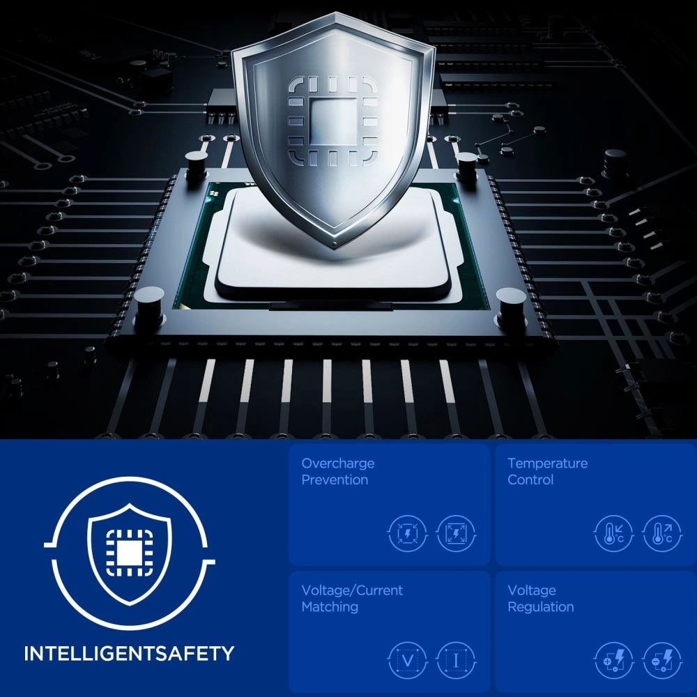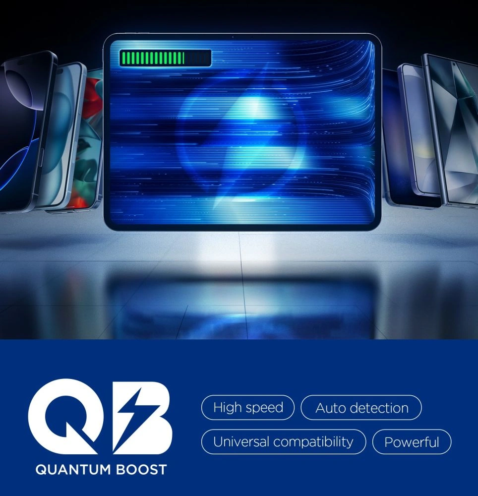 Technologia Quantum Boost automatycznie dopasowuje moc ładowania do podłączonego sprzętu, maksymalizując jego wydajność. Wbudowane funkcje Overcharge Prevention, Voltage Matching i Voltage Regulation chronią urządzenia przed przeładowaniem, nadmiernym napięciem i niestabilnym prądem, zapewniając bezpieczne i stabilne ładowanie w każdych warunkach.