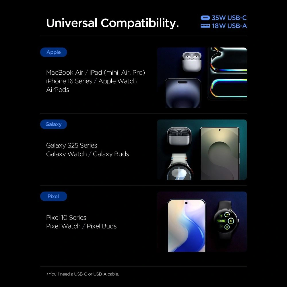 Spigen Essential EE352EU to kompaktowa, wydajna ładowarka sieciowa GaN Pro, zaprojektowana z myślą o szybkim i bezpiecznym ładowaniu dwóch urządzeń jednocześnie. Dzięki dwóm portom – USB-C 35W oraz USB-A 18W – pozwala na elastyczne zasilanie smartfonów, tabletów, słuchawek czy innych akcesoriów, zapewniając optymalną moc dla każdego podłączonego urządzenia.