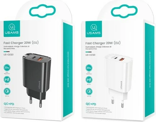 USAMS T35 US-CC121 20W to ładowarka sieciowa z szybkim i stabilnym ładowaniem, wyposażona w dwa porty: USB-C PD3.0 Fast Charging i USB Quick Charger
