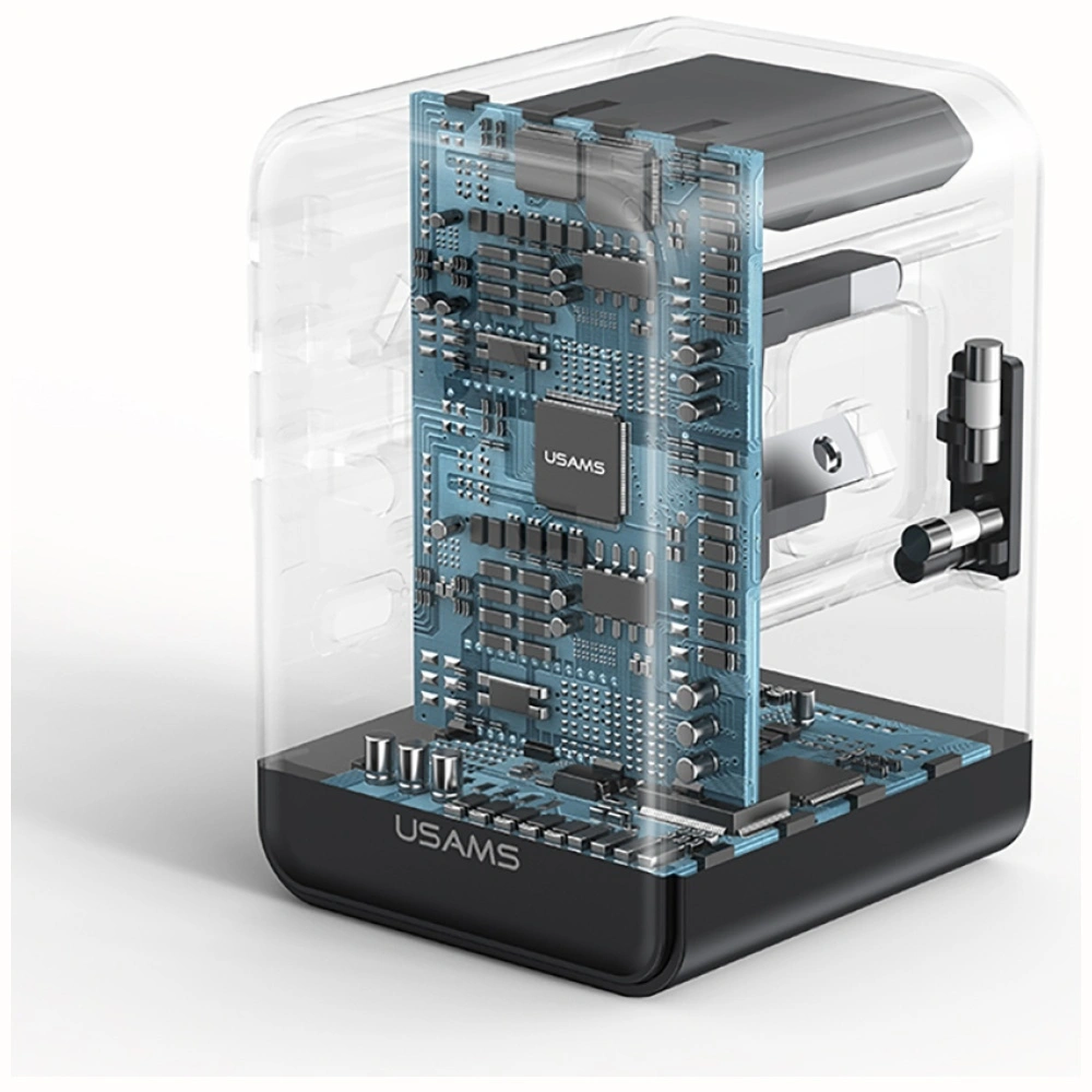 USAMS Travel Adapter oferuje wyjątkową moc i uniwersalność, obsługując różne standardy zasilania. Adapter wyposażony jest w gniazda 2 x USB-A oraz 3 x USB-C, co pozwala na ładowanie wielu urządzeń jednocześnie.