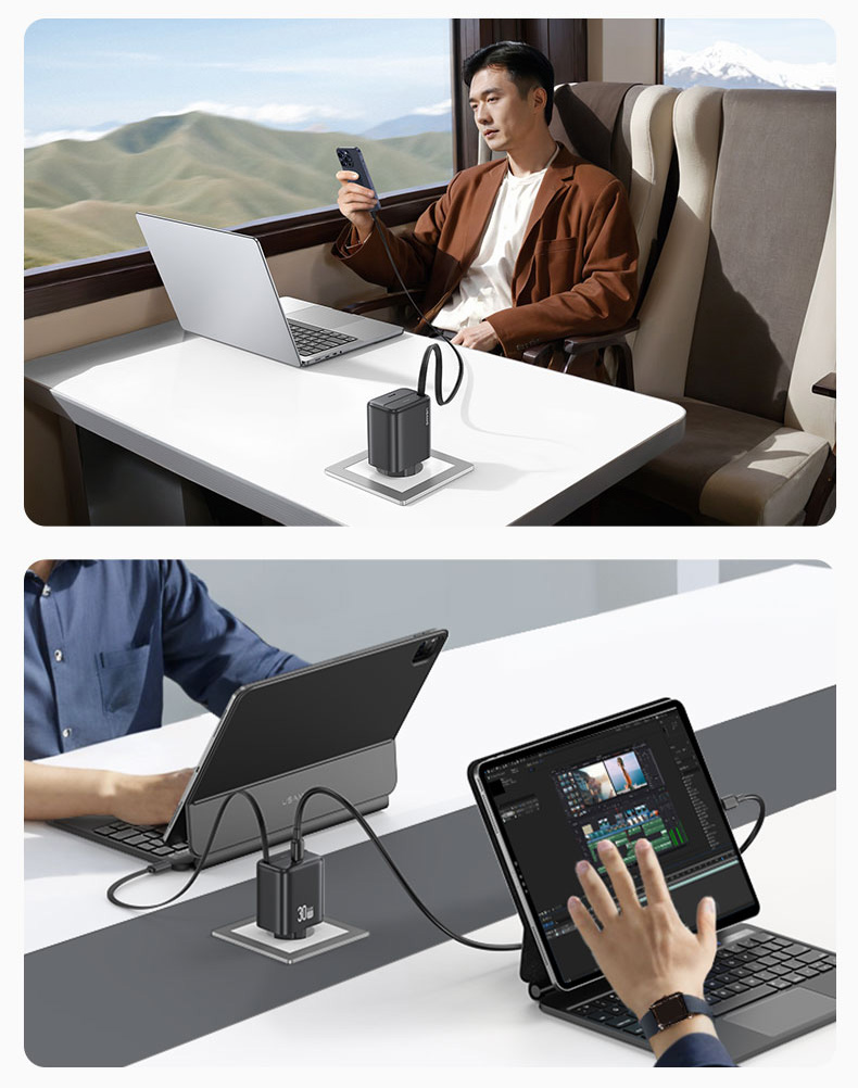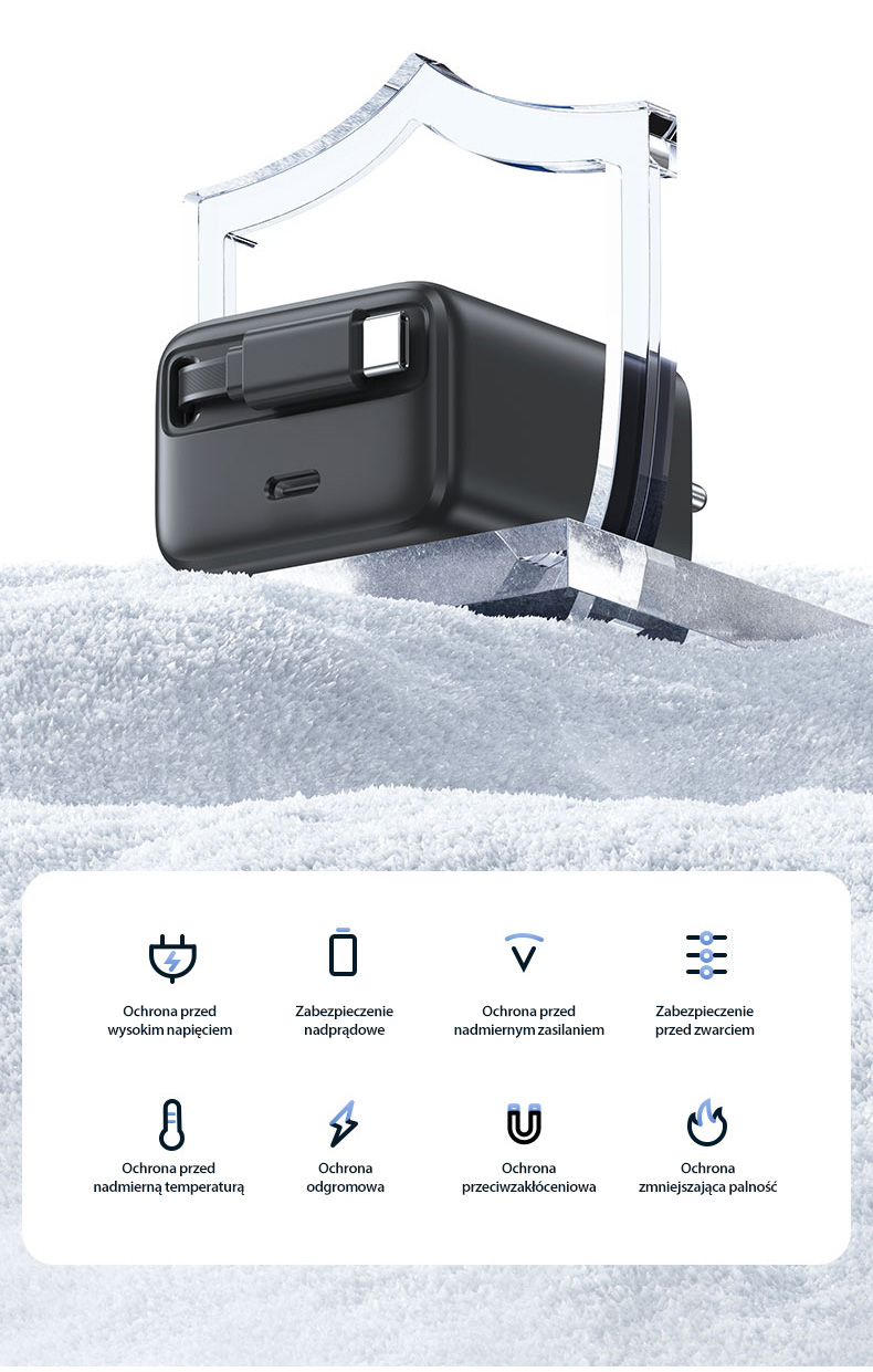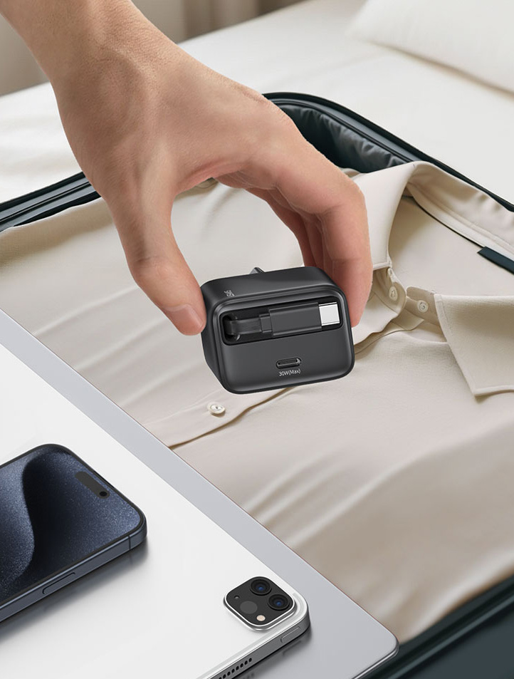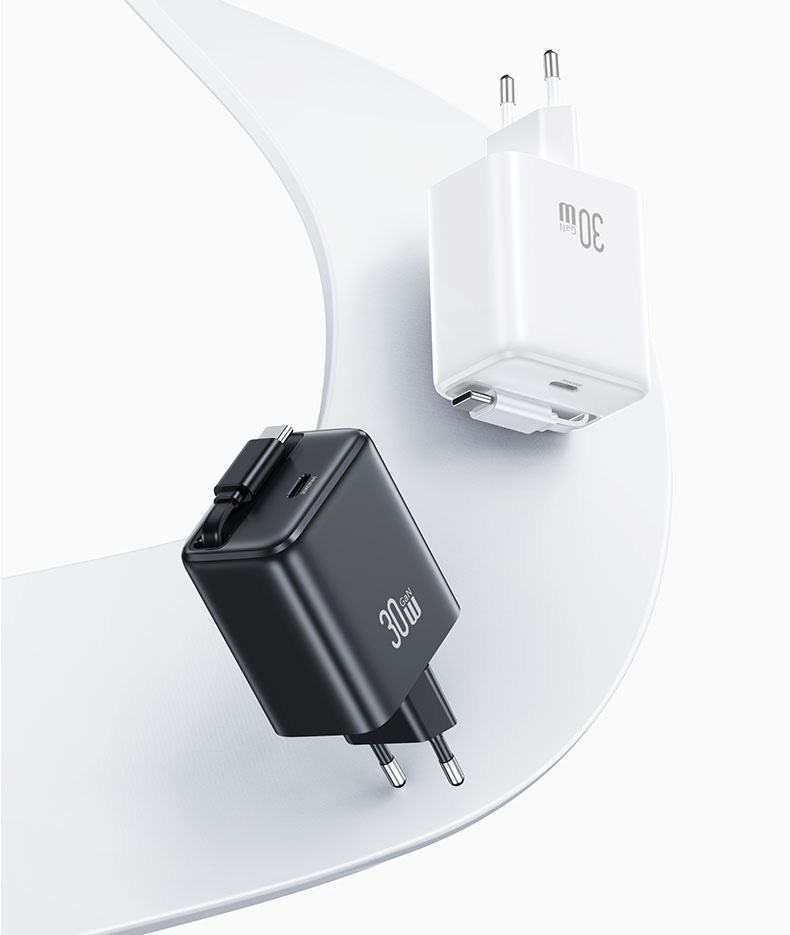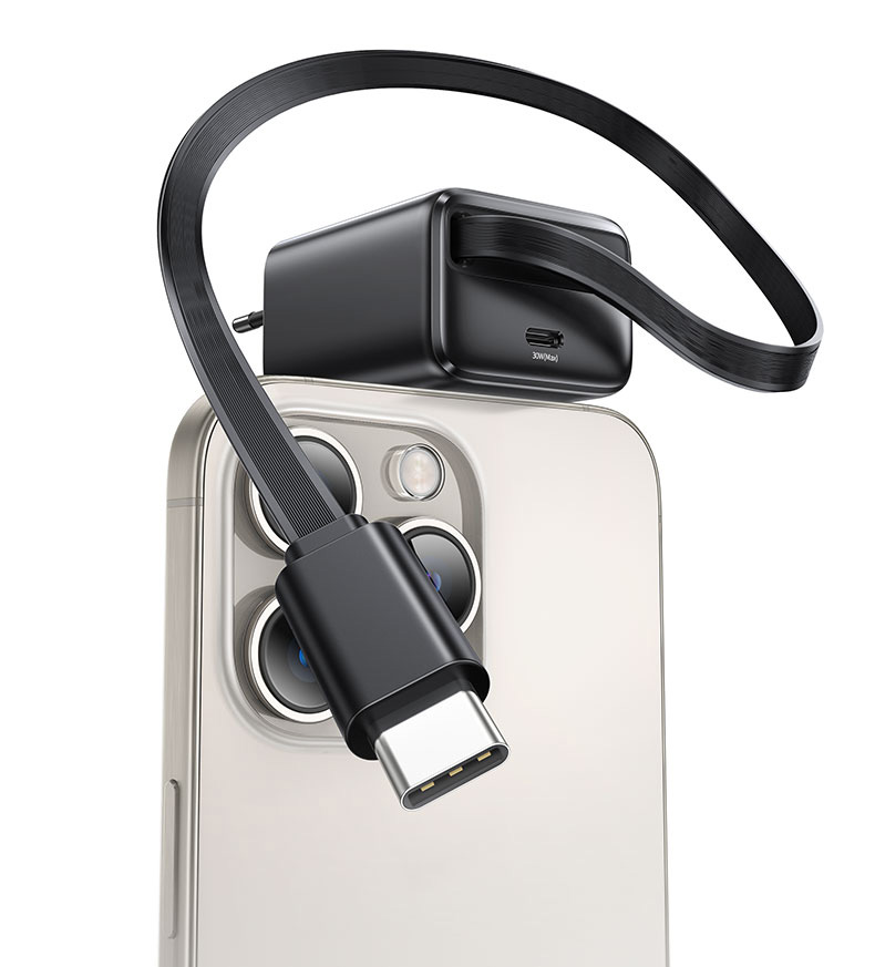 W zestawie znajduje się kabel do szybkiego ładowania o mocy 30W. Pożegnaj się z szukaniem kabla wszędzie. Aby wysunąć kabel wystarczy dosłownie jedno pociągnięcie, przez co możesz natychmiast połączyć swoje urządzenie i cieszyć się szybkim zasilaniem.