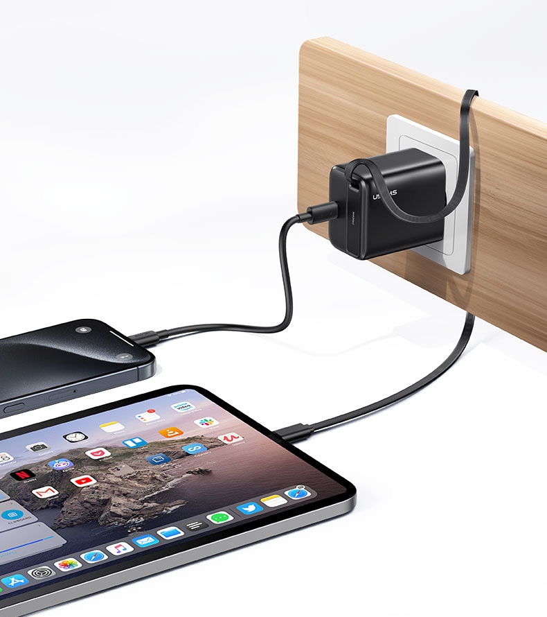 Oszczędź swój czas i ładuj kilka urządzeń jednocześnie! Kabel typu C + podwójny port wyjściowy typu C, w które wyposażona jest ładowarka USAMS, spełnia wszelkie potrzeby dotyczące ładowania wielu urządzeń.