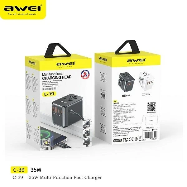 Ładowarka sieciowa podróżna AWEI C-39 2xUSB-A, 3xUSB-C 35W US/AU/EU/UK czarny/black