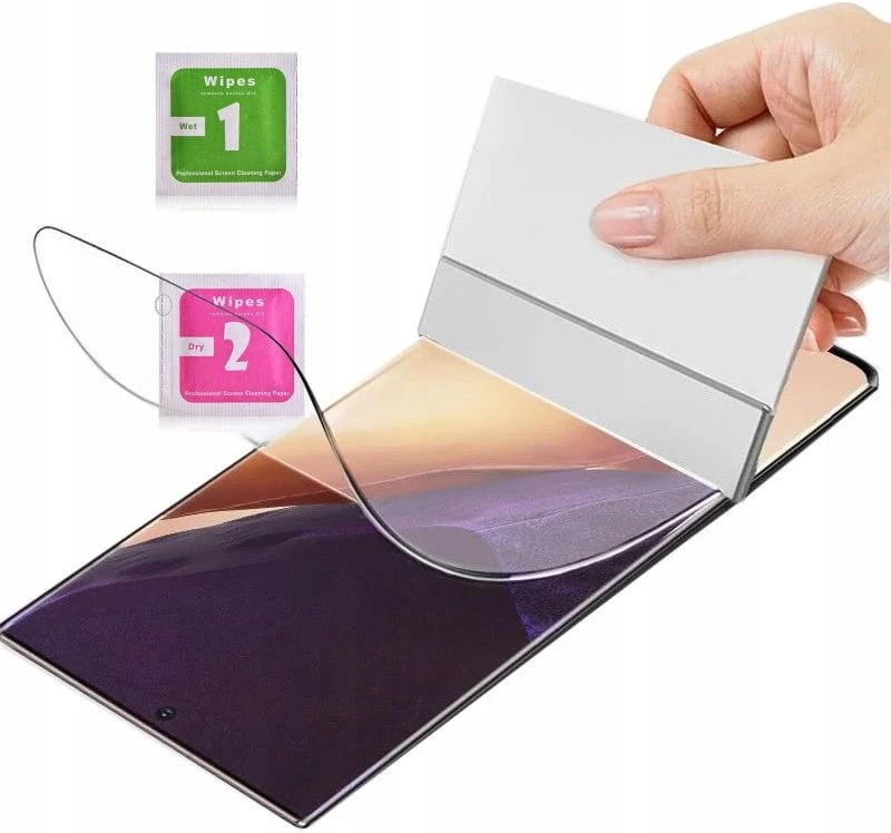 - Wyczyść dokładnie ekran za pomocą dołączonych ściereczek. Zalecamy nie wycierać ekranu suchą ściereczką, lecz pozostawić ekran wilgotny - hydrogel osadzi się dzięki temu bardzo gładko.