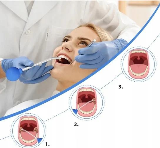Ręczne narzędzie do czyszczenia migdałków to praktyczny, domowy przyrząd przeznaczony do precyzyjnego usuwania kamieni migdałkowych (tonsillolithów) oraz nagromadzonych resztek pokarmowych i bakterii z zagłębień migdałków, które często odpowiadają za nieświeży oddech. Dzięki połączeniu dużej gruszki ssącej i przezroczystej, grubej rurki szklanej użytkownik (najlepiej z pomocą drugiej osoby) może delikatnie zbliżyć końcówkę do kamienia, wytworzyć podciśnienie i bezpiecznie wyciągnąć zalegający osad, bez mechanicznego drażnienia czy uszkadzania tkanki. Konstrukcja jest lekka, trwała i wielorazowa, co czyni ją ekonomicznym rozwiązaniem dla osób zmagających się z nawracającymi kamieniami migdałkowymi i pragnących samodzielnie poprawić swoją higienę jamy ustnej.