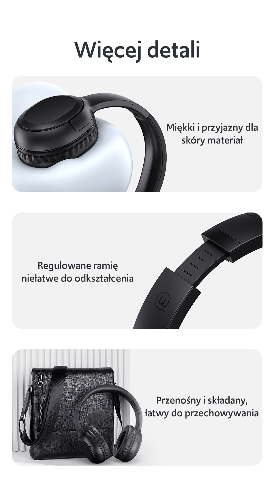 Idealnie zapakowane nauszniki wykonane z materiału dźwiękoszczelnego zmniejszają wyciek dźwięku na zewnątrz, co pozwala użytkownikowi cieszyć się doskonałą jakością dźwięku bez zakłóceń z otoczenia. To zapewnia pełne skupienie na muzyce lub rozmowie, niezależnie od warunków otoczenia.