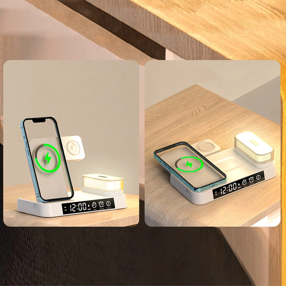Ładowarka bezprzewodowa 4w1 umożliwia na jednoczesne ładowanie bezprzewodowe iPhone, Apple Watch, AirPods, posiada zegarek z alarmem oraz posiada podłączaną multikolorową lampkę LED.