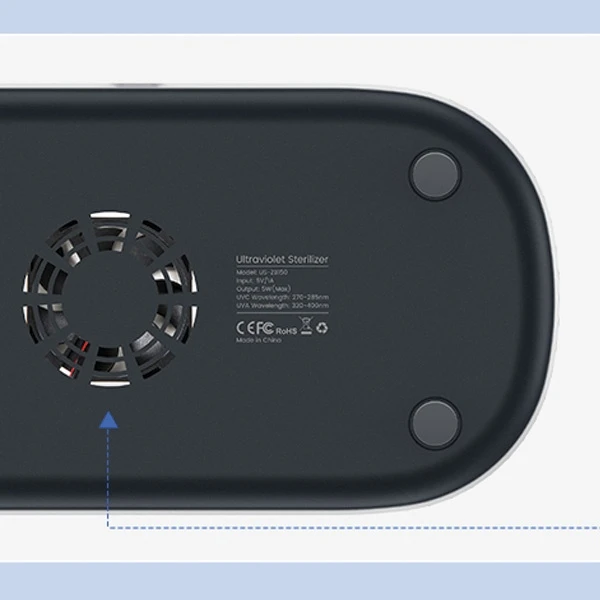 Usams US-ZB151 wielofunkcyjny, mini sterylizator UV-C z funkcją bezprzewodowego ładowania smartfonów 15W.