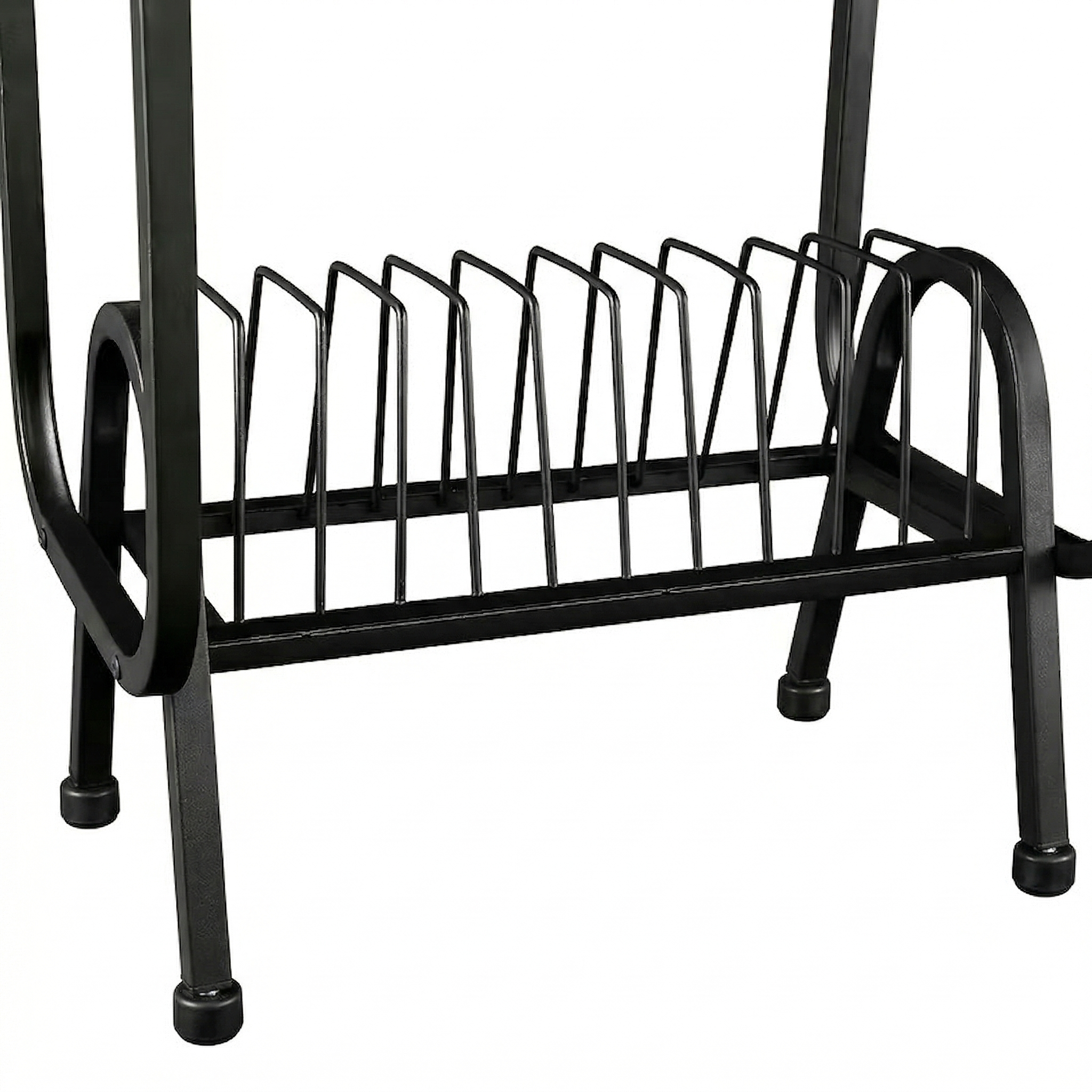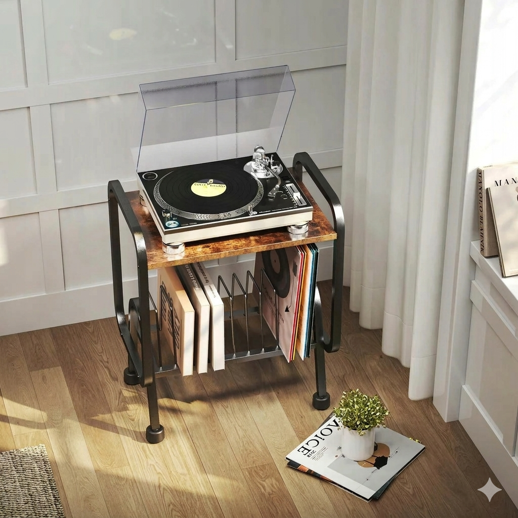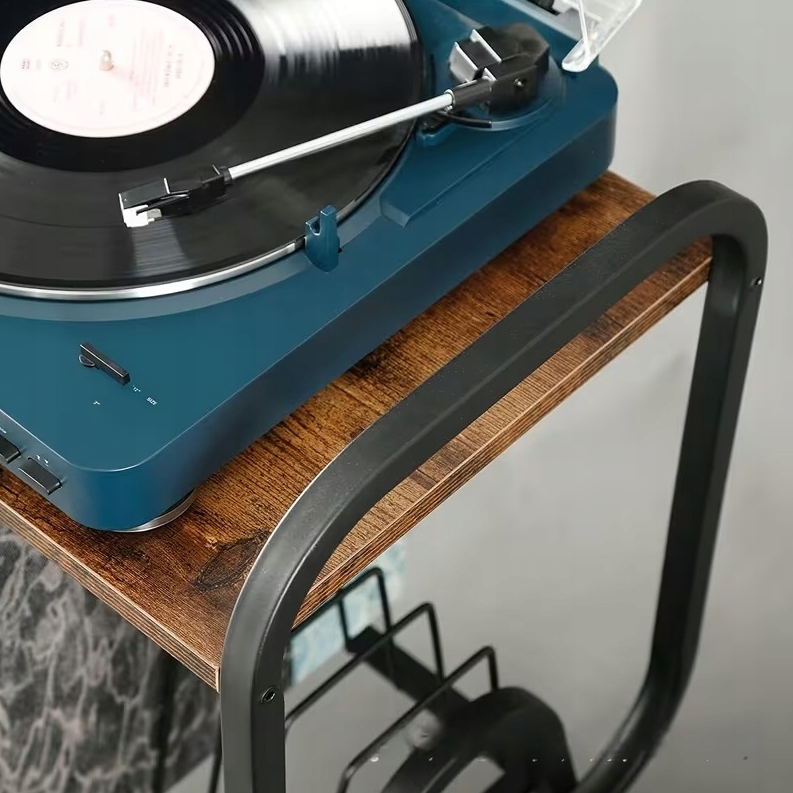 Połączenie solidnej metalowej ramy z brązowym wykończeniem drewnianym nadaje konstrukcji wyjątkowy, nostalgiczny charakter, który doskonale wpisuje się w aranżacje retro, loftowe oraz nowoczesne. Górna półka została zaprojektowana tak, aby pomieścić większość gramofonów z wbudowanymi głośnikami, zapewniając stabilne miejsce do ich użytkowania.