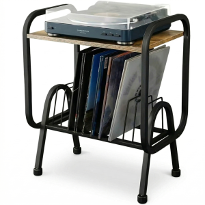 Dolna część stolika oferuje praktyczną przestrzeń do przechowywania kolekcji płyt winylowych, mieszcząc nawet około 60 albumów, co pozwala utrzymać muzyczną kolekcję w uporządkowany sposób i zawsze mieć ją pod ręką.