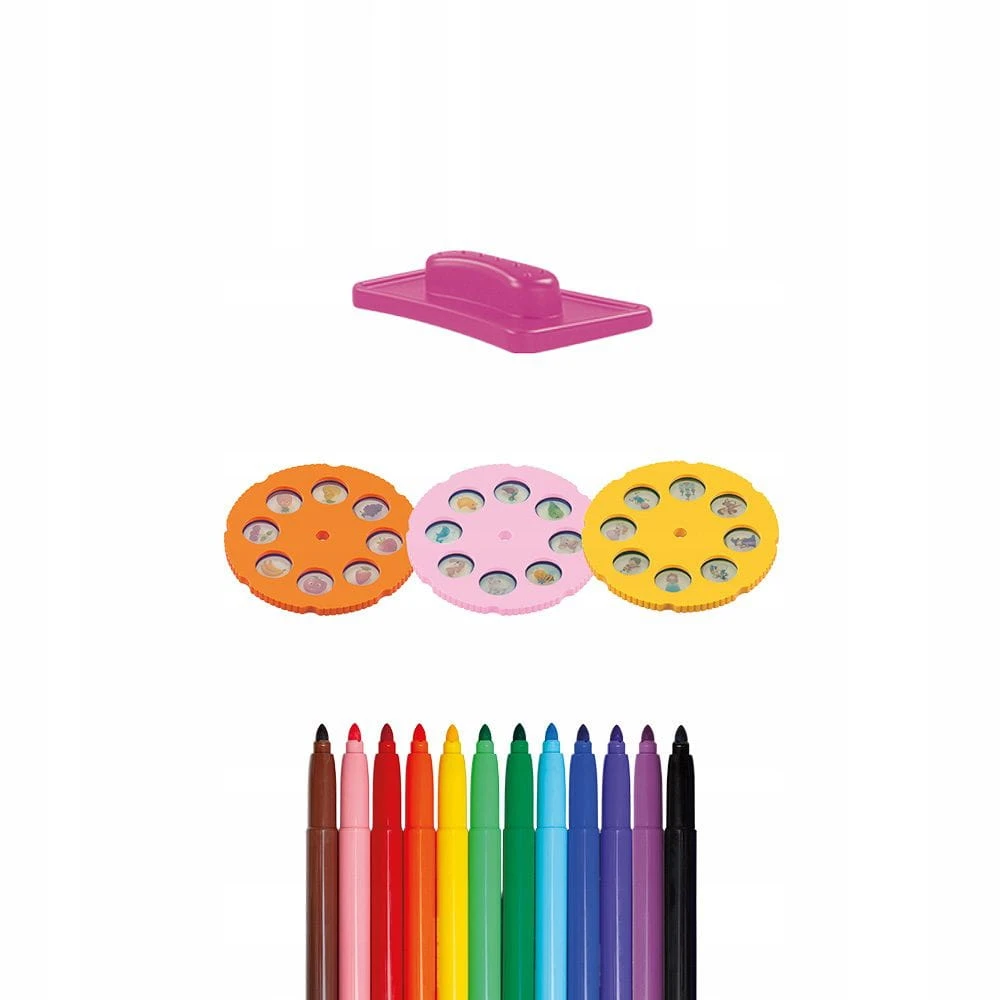 ✅ Zestaw zawiera: Projektor, stolik, 3 dyski ze slajdami, gąbkę, 12 mazaków suchościeralnych.