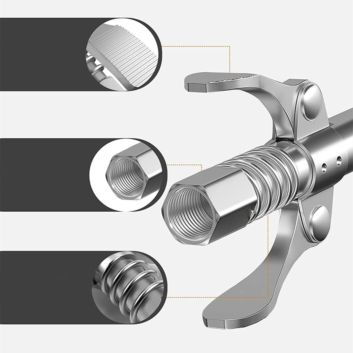Konstrukcja 6-szczękowa ułatwia zarówno zatrzaskiwanie, jak i zwalnianie smarowniczek, co przyspiesza i ułatwia proces smarowania.