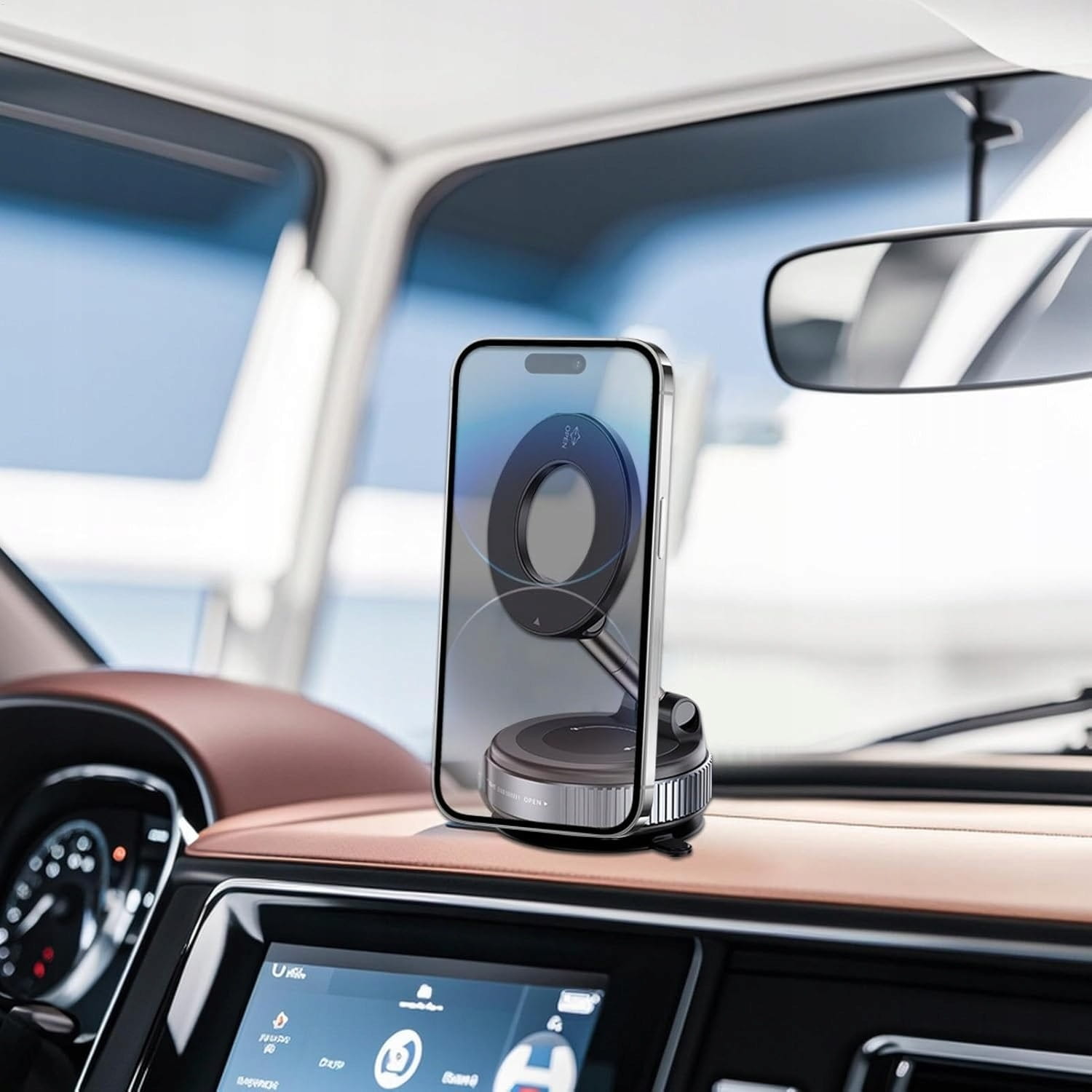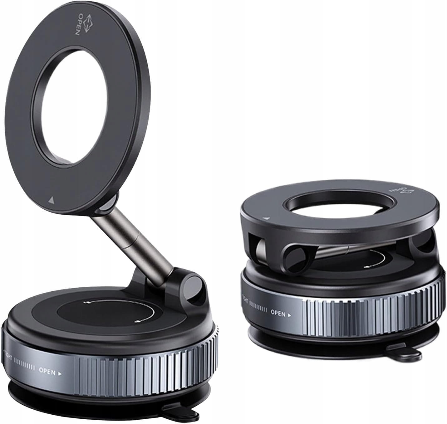 Ogromną zaletą tego modelu jest pełna regulacja kąta widzenia - ramię można obracać o 360° i składać o 180°, co pozwala ustawić telefon w pionie lub poziomie, dokładnie tak, jak potrzebujesz. Uchwyt obsługuje zarówno iPhone’y z systemem MagSafe, jak i inne smartfony po zastosowaniu dołączonego metalowego pierścienia, dzięki czemu jest rozwiązaniem uniwersalnym. Minimalistyczny design sprawia, że dobrze komponuje się z wnętrzem auta, a jego kompaktowa forma umożliwia łatwe przechowywanie, gdy nie jest używany.