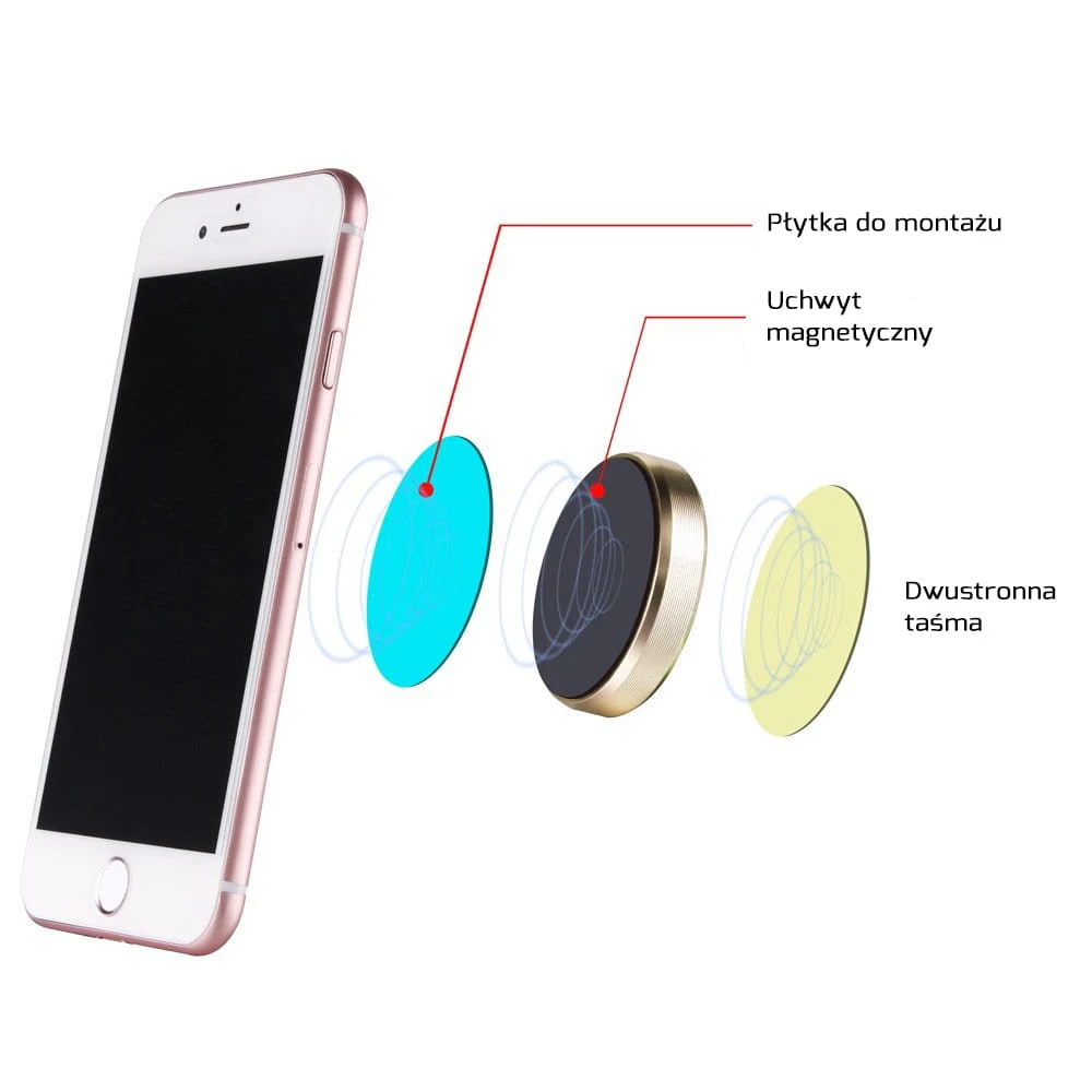 Zestaw składa się z metalowej płytki, którą możemy zamontować bezpośrednio na telefonie, bądź pod swoim etui/pokrowcu, uchwytu magnetycznego o średnicy 3 cm oraz mocnej, dwustronnej taśmy.
