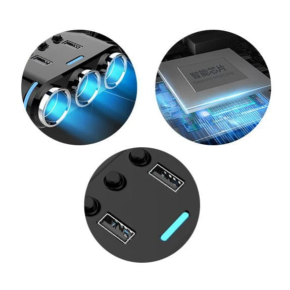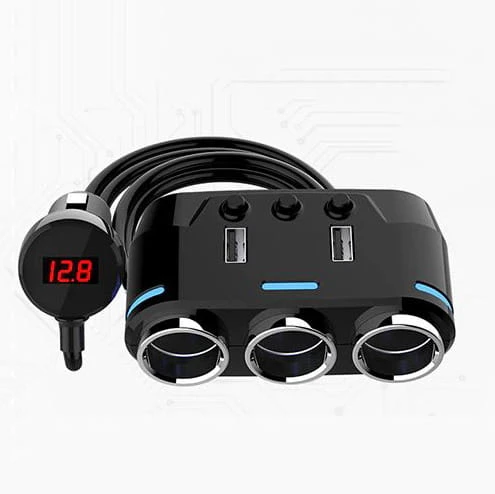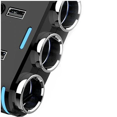 Posiada 2 złącza USB do ładowania urządzeń, 3 złącza zapalniczki, 3 odpowiadające im wyłączniki, podświetlenie LED portów/gniazd oraz miernik napięcia z wyświetlaczem.