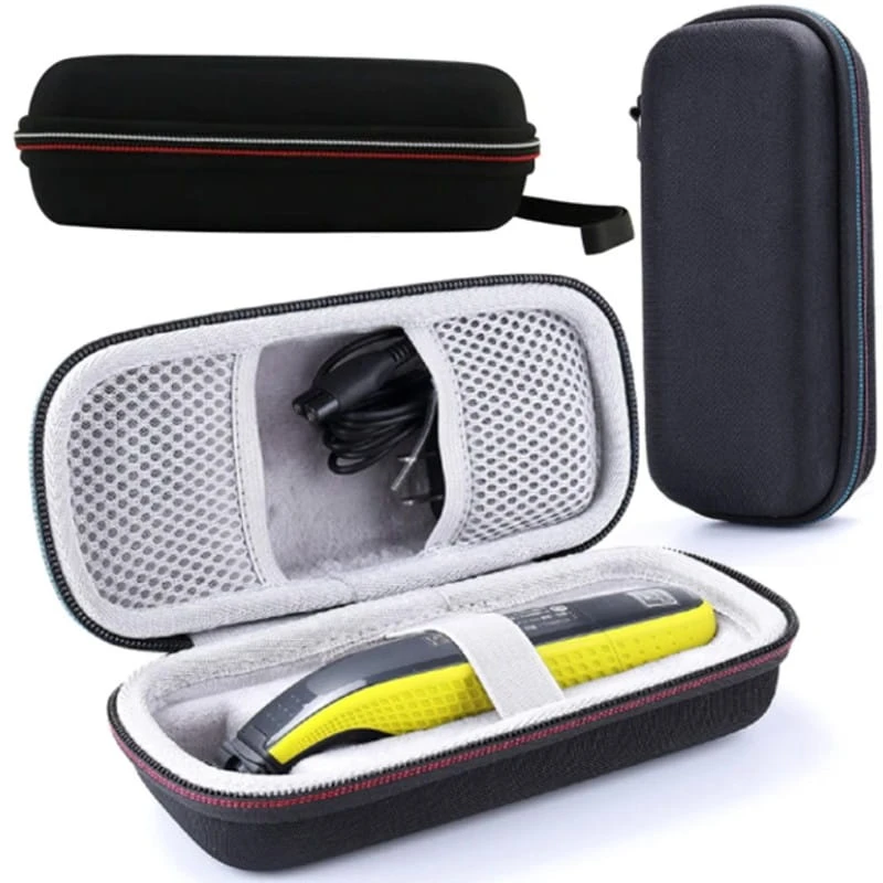 Etui wyposażone jest w zamek błyskawiczny oraz smycz, co ułatwia przechowywanie i transport golarki. Wnętrze etui zostało wyściełane miękkim materiałem, zapewniając maksymalną ochronę urządzenia przed uszkodzeniami. Elastyczna siateczka w wewnętrznej kieszonce utrzymuje ładowarkę i ostrza na miejscu, chroniąc je przed przemieszczaniem się.