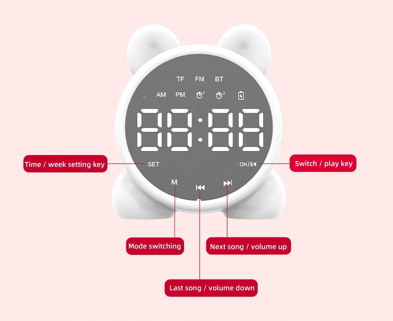 Zegar Budzik LED "Kotek" Multifunkcyjny - Radio FM, Głośnik Bluetooth, Lusterko - Różowy