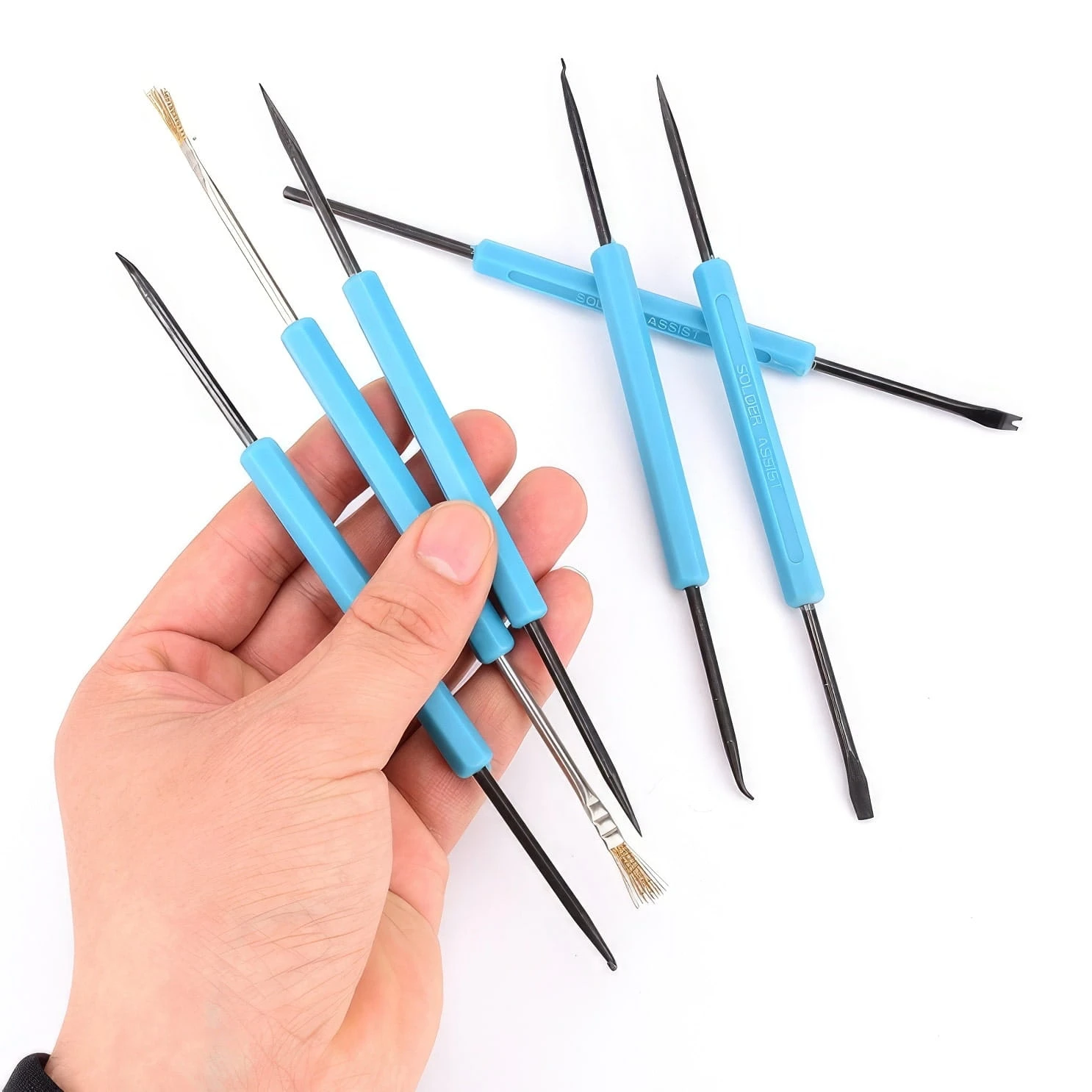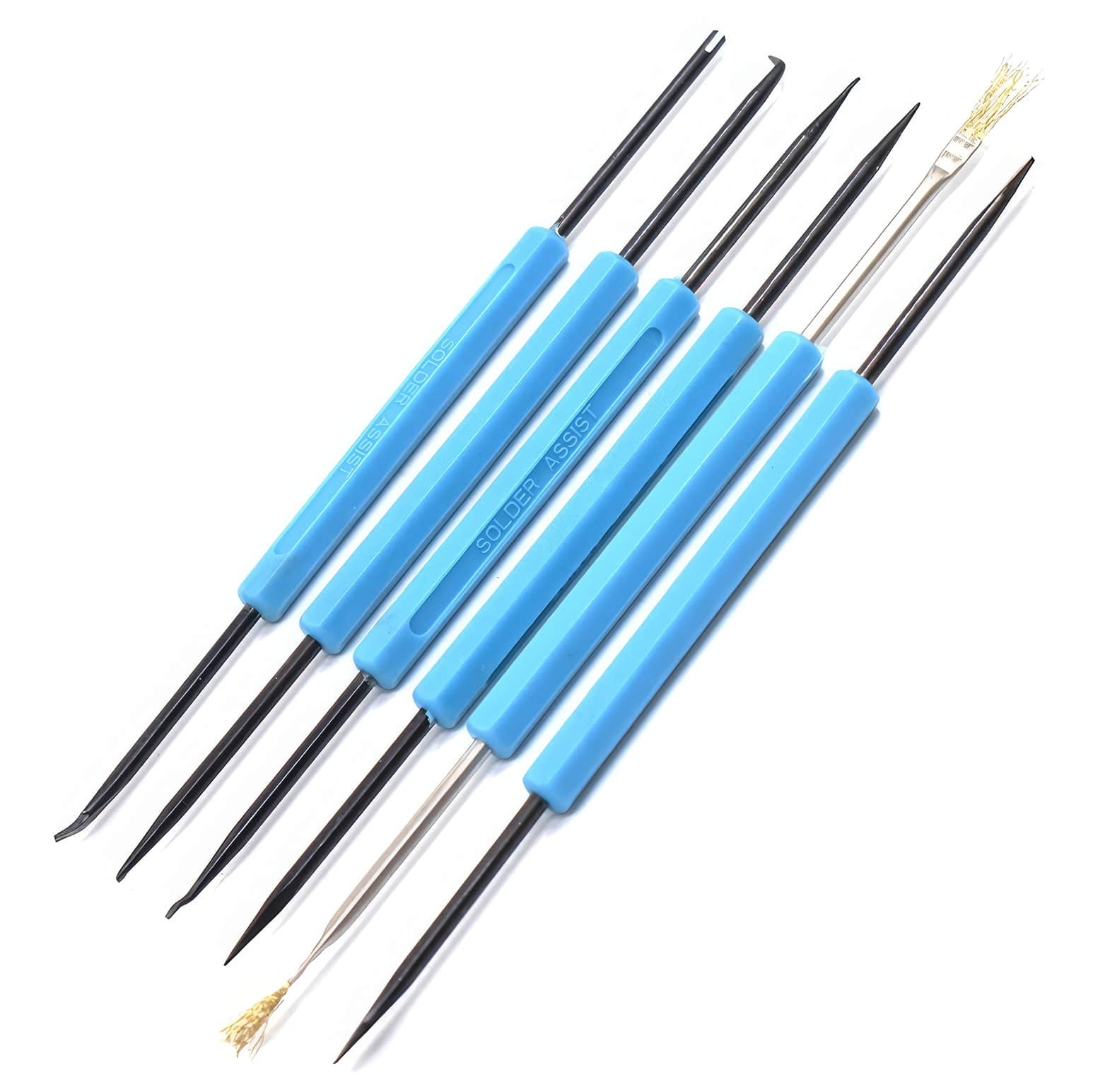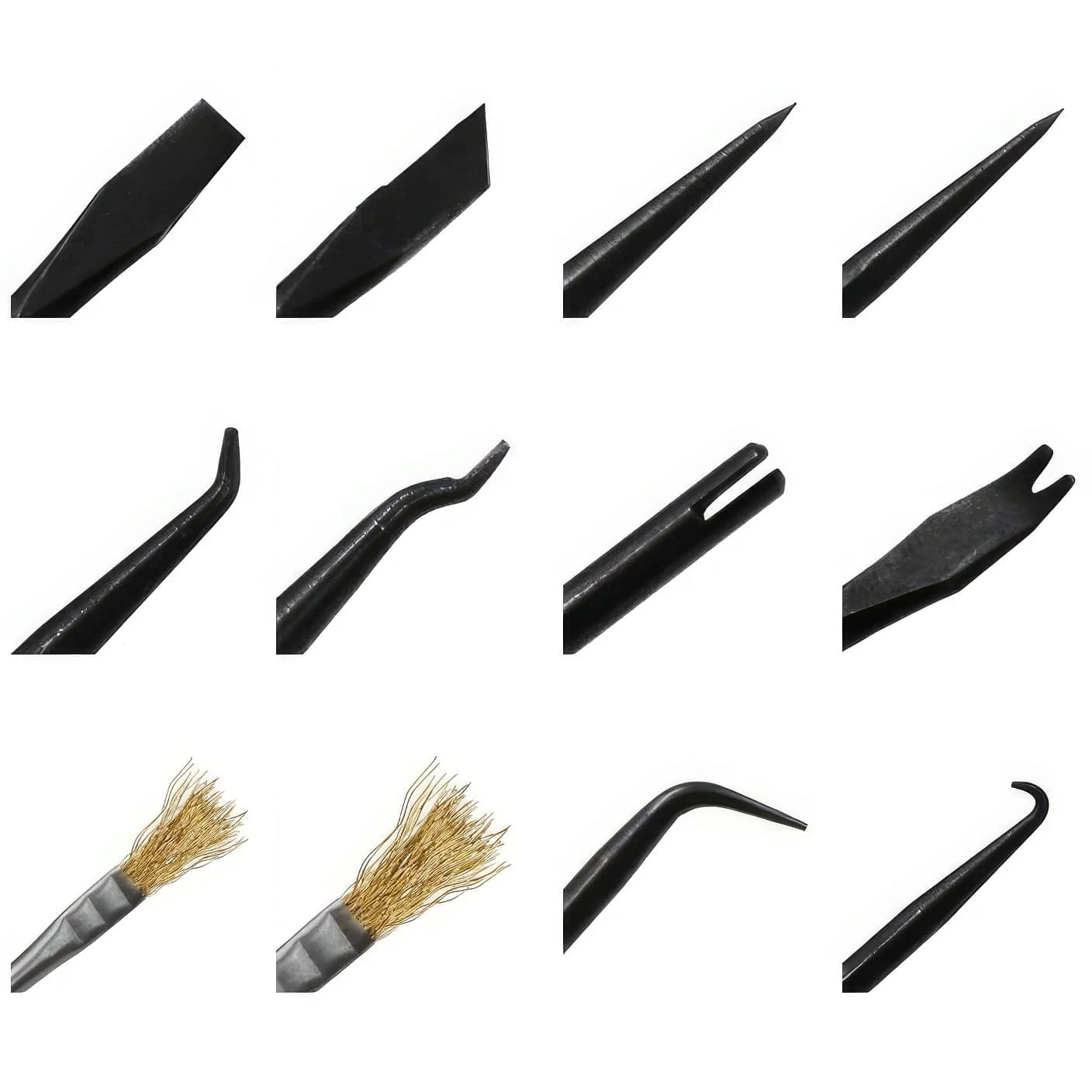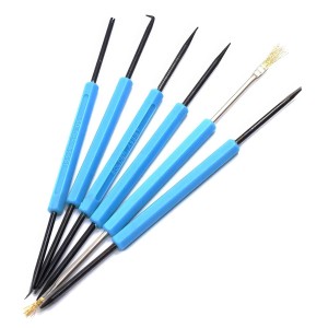 Haczyki zagięte i odgięte oraz widełki zakrzywione pozwalają na precyzyjne ustawienie elementów przed lutowaniem. Czyścik z wcięciem i haczyk do podważania odgięty ułatwiają usuwanie zanieczyszczeń z otworów montażowych. Natomiast haczyk do podważania podwójnie zagięty jest przydatny przy usuwaniu elementów z płyty drukowanej.