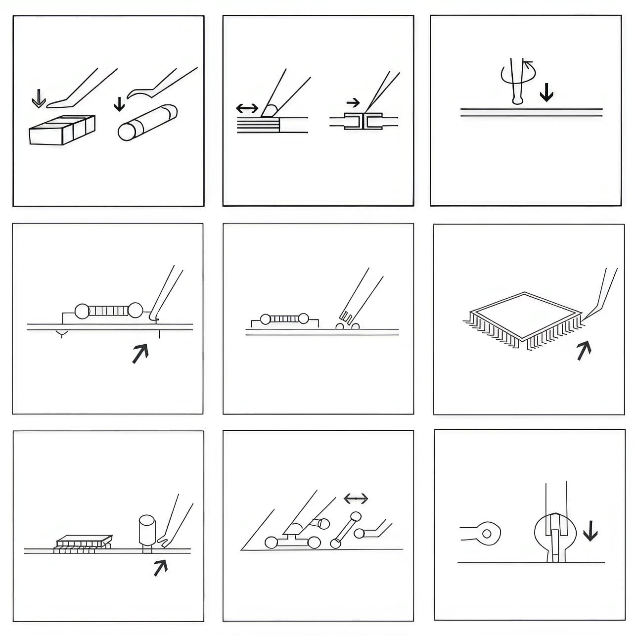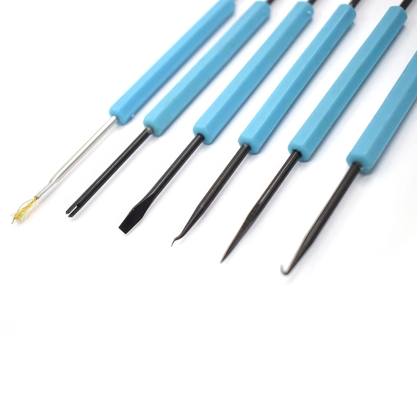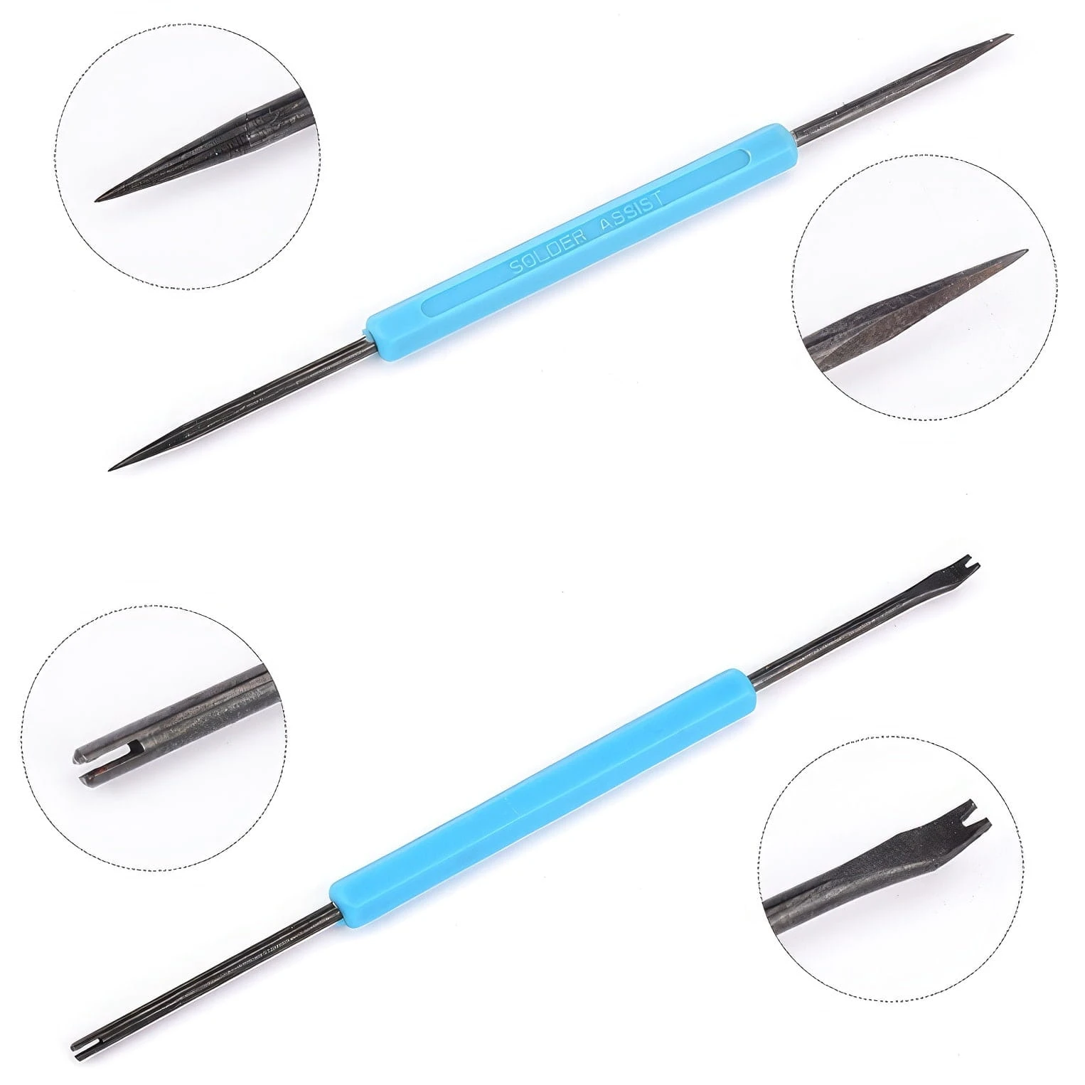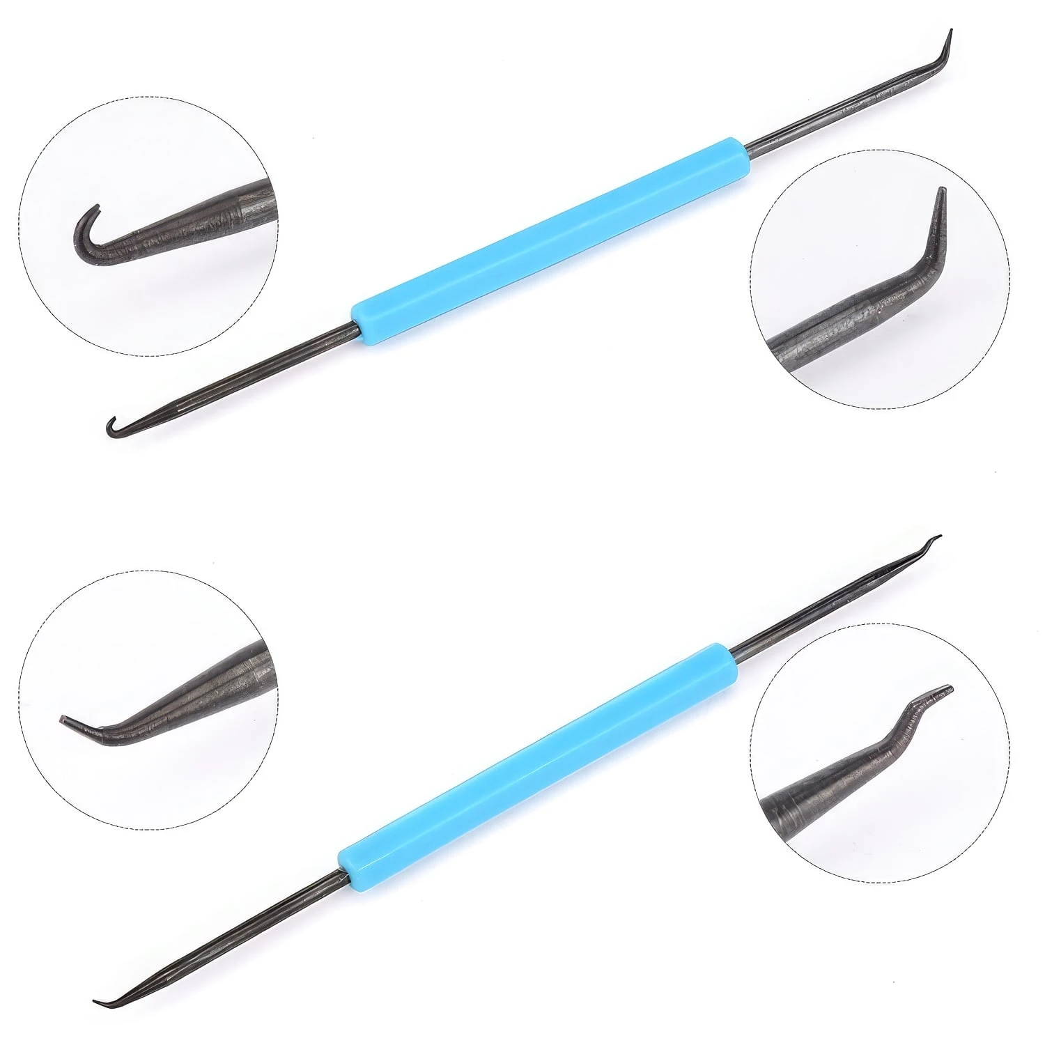 Haczyki zagięte i odgięte oraz widełki zakrzywione pozwalają na precyzyjne ustawienie elementów przed lutowaniem. Czyścik z wcięciem i haczyk do podważania odgięty ułatwiają usuwanie zanieczyszczeń z otworów montażowych. Natomiast haczyk do podważania podwójnie zagięty jest przydatny przy usuwaniu elementów z płyty drukowanej.