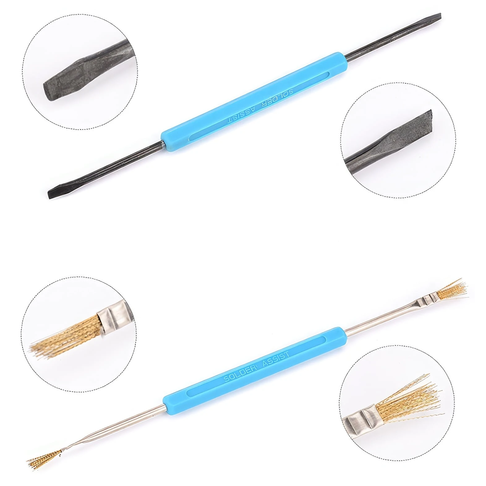W zestawie znajdują się dwa rodzaje pędzelków - mały i duży, które służą do precyzyjnego nakładania pasty lutowniczej na elementy elektroniczne. Skrobak prosty i kątowy pozwala na dokładne oczyszczenie powierzchni elementów przed lutowaniem, a szpikulce okrągły i czterokatny są przydatne do usuwania resztek lutu.